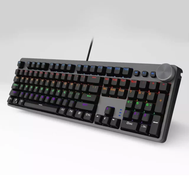 Your product’s basic features include a full-sized key layout, a mechanical operation style, and a mix of backlit colors that create a thrilling gaming ambiance. Best used in your gaming den, this keyboard transforms every keystroke into a tactile and auditory experience. The multi-function knobs add a layer of utility, allowing you to adjust volume or settings on-the-fly without pausing the action.