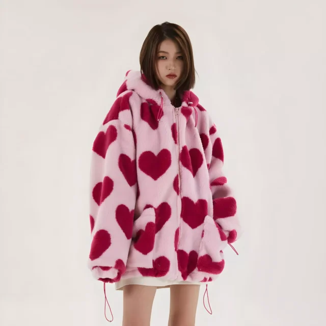 Don’t let the spring chill dampen your style. Add the Harajuku Heart Print Plush Hooded Jacket to your wardrobe and enjoy the perfect mix of warmth, comfort, and fashion. Shop now to make a statement this season!