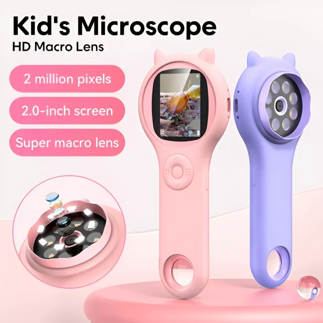 The Mini Kids Optical Microscope stands out with its photo and video capabilities, offering an interactive learning experience beyond simple observation. With up to 500x magnification, children can see the intricate details of the microscopic world while capturing and saving their discoveries. It’s an educational tool that promotes exploration, creativity, and a deeper understanding of science in a fun and accessible way.