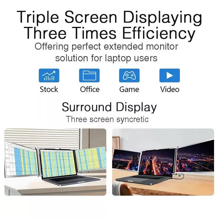 Elevate your work and play with our Tri-Screen Portable Monitor. Specifically designed for those who thrive on multitasking and efficiency, this innovative product extends your laptop’s display with ease. Its 14-inch, 16:10 aspect ratio, and 1920×1200 FHD resolution provide a stunning and seamless visual experience. Ideal for professionals, gamers, and tech enthusiasts, this portable monitor is a game-changer for enhancing productivity and entertainment on the go.